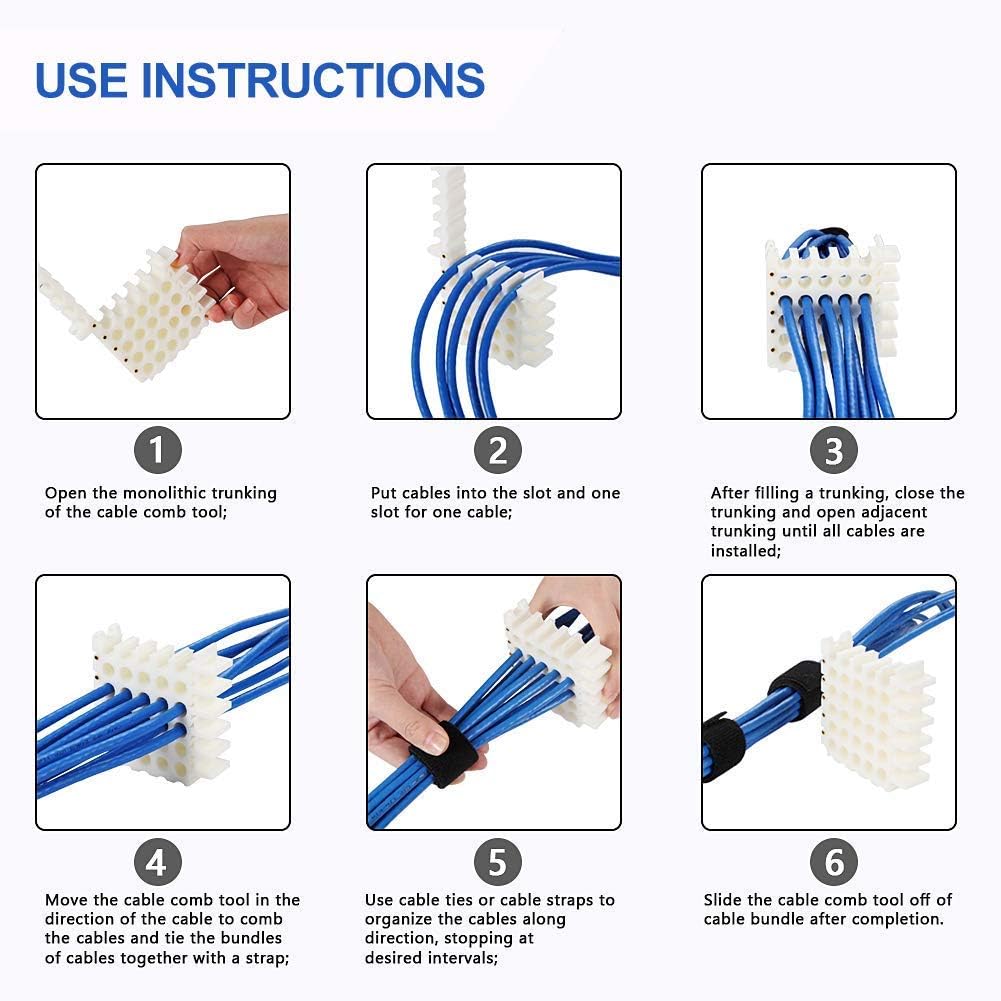 The cable bundle organizing tool conveniently separates and organizes cables just like the teeth of a standard comb separates hair.